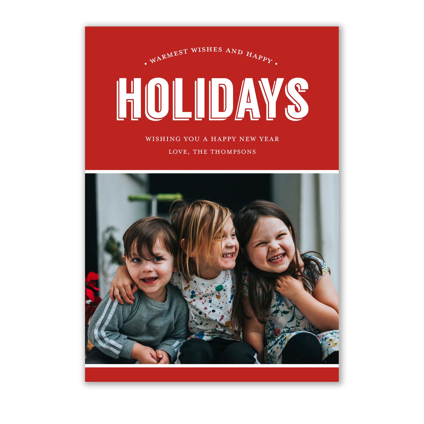 This holiday photo card by Noteworthy Collections features a top and bottom red background. The cards come with white unlined envelopes.