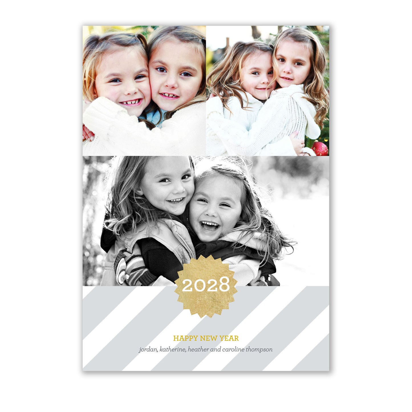 This holiday photo card by Noteworthy Collections features a modern diagonal stripes pattern with a gold ornament where the year goes. The cards come with white unlined envelopes.