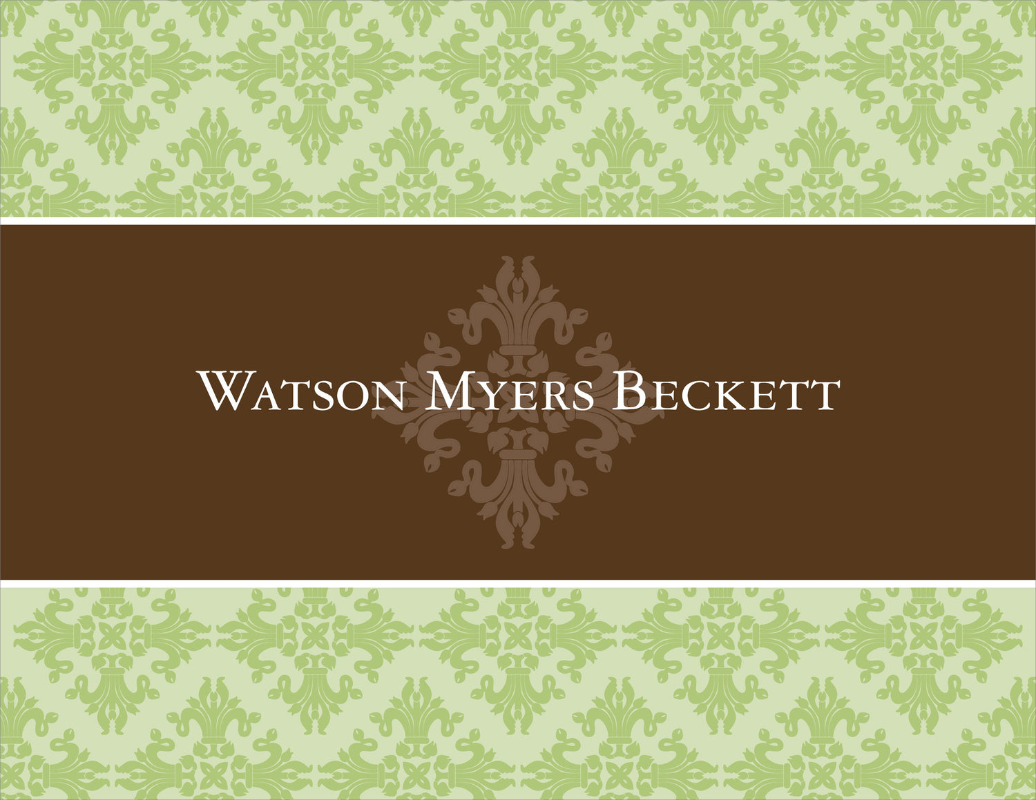 Elegant and classic, this top fold white notecard features a wasabi green damask patterned background. A brown stripe screened with a damask design adorns the center of the card. Includes white unlined envelopes.