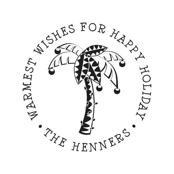 Happy Tropical Holidays! Decorate your mailing envelopes, holiday stationery, gift tags or greeting cards with your mark with this holiday personalized designer self-inking stamp. A palm tree strung with Christmas ornaments and lights adorns the center of the stamp and your personalized text circles the design. Each stamp comes with one black ink cartridge which allows approximately 8,000 to 10,000 impressions. You can elect to order additional color ink cartridges for $10.95 each.