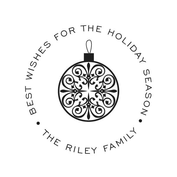 Happy Holidays! Decorate your mailing envelopes, holiday stationery, gift tags or greeting cards with your mark with this holiday personalized designer self-inking stamp. A decorated ornament sits in the middle of the stamp and your personalized text circles the design. Each stamp comes with one black ink cartridge which allows approximately 8,000 to 10,000 impressions. You can elect to order additional color ink cartridges for $10.95 each.