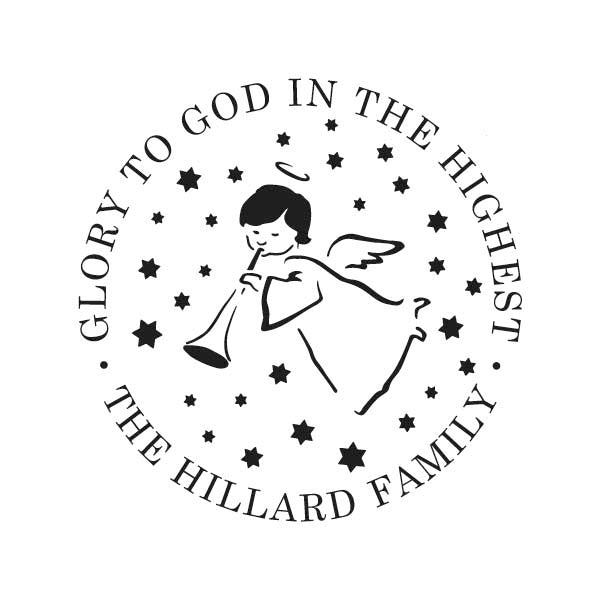 Glory to God this holiday season! Decorate your mailing envelopes, holiday stationery, gift tags or greeting cards with your mark with this holiday personalized designer self-inking stamp. An angel flying with her horn through a starry sky sits in the middle of the stamp and your personalized text circles the design. Each stamp comes with one black ink cartridge which allows approximately 8,000 to 10,000 impressions. You can elect to order additional color ink cartridges for $10.95 each.