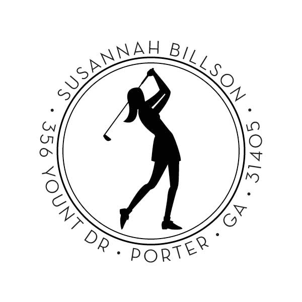 Hole in one! Decorate your sports stationery, books, letters, gift tags, return address stamps or embossers or for whatever other things you can think of, with these unique designer self-inking stamps or embossers. Add your personalized text to the outer circle of the design that frames a lady golfer mid-swing. Each stamp comes with one black ink cartridge which allows approximately 8,000 to 10,000 impressions. You can elect to order additional color ink cartridges for $10.95 each.